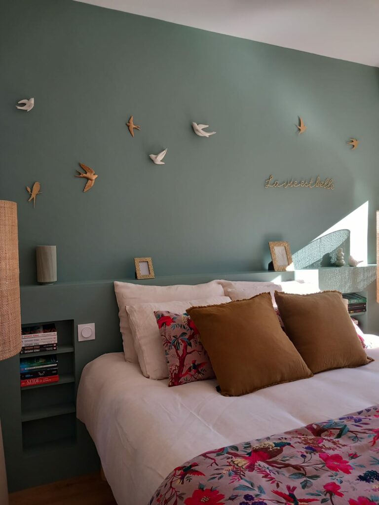 Nous avons imaginé un lieu, où les couleurs évoquent celles de la nature, vert sauge, terracotta. Les fleurs, les oiseaux sont de la partie !